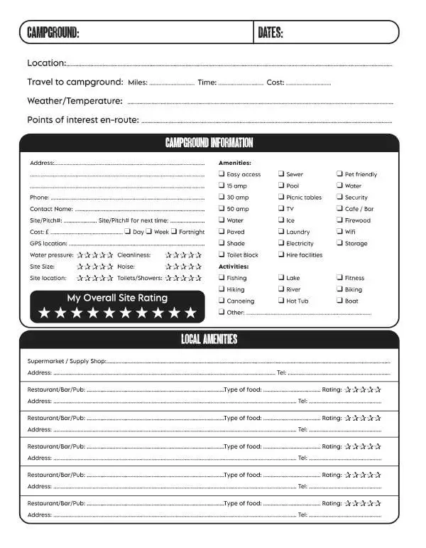 This camper van logbook is perfect for all types camper road trips, vacations and holidays. Track and record campground information, destinations, costs, activities and memories in this comprehensive camping keepsake. Included in this new updated edition is a local amenities section where you can enter local supermarkets and nice restaurants local to your campsite. Great for return visits to your favourite destinations as all the leg work in discovering your surroundings will be recorded in your camper diary!